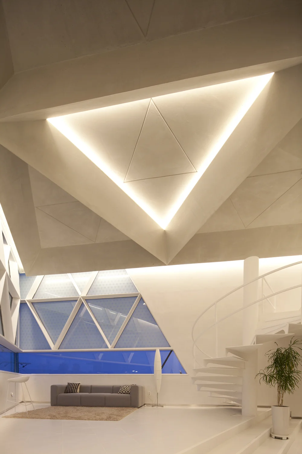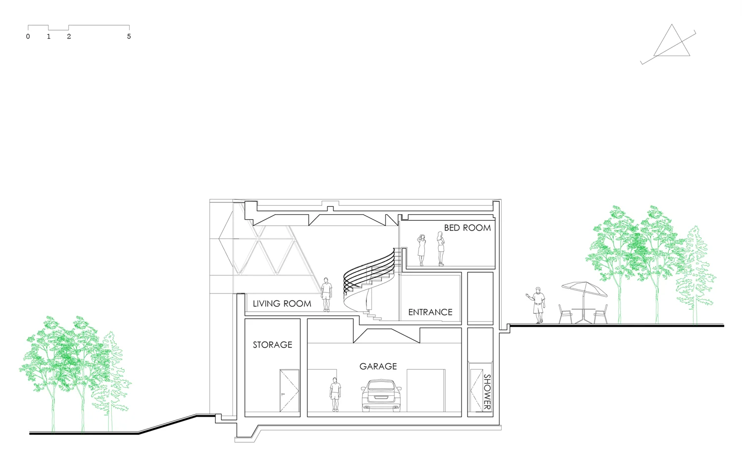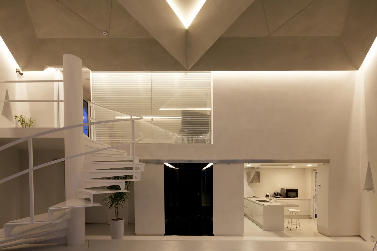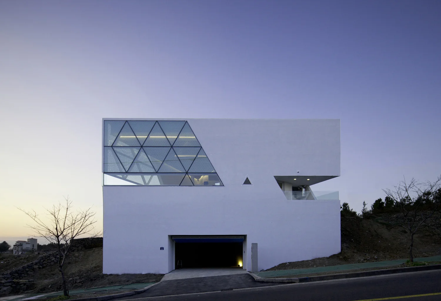 급경사에 위치한 삼각형의 대지 안에 삼각형 평면이 구획되었다. 삼각형은 평면을 넘어 천장과 창문 구조, 문 디자인, 타일 모양에까지 연결된다.
