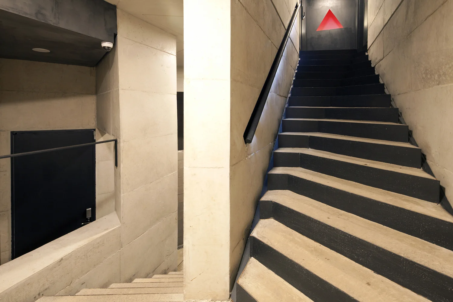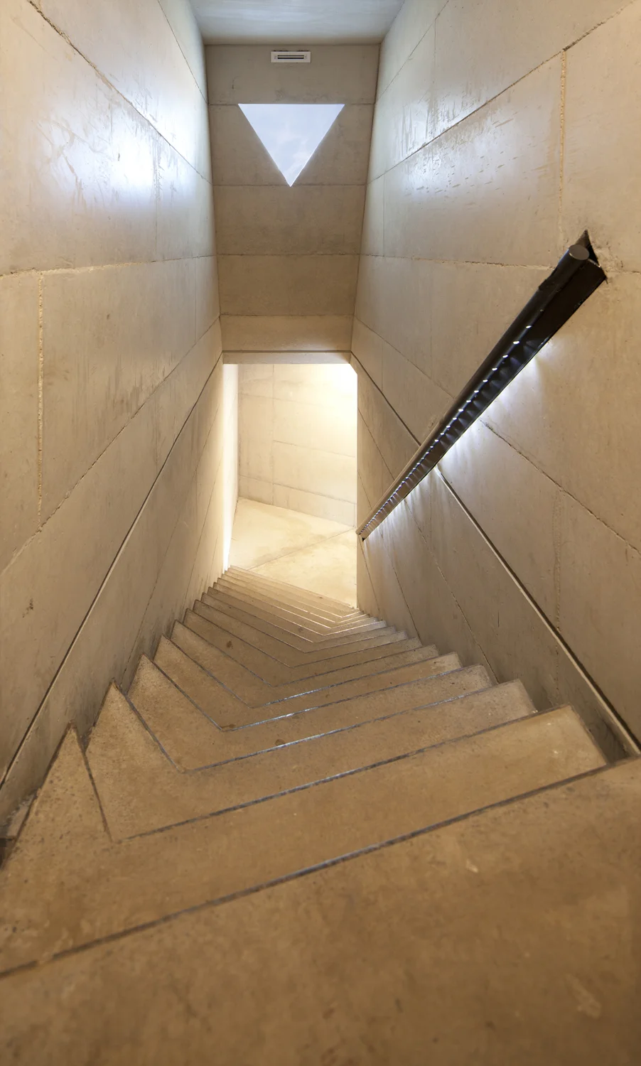 주차장에서 현관과 마당을 이어주는 계단이다. 계단의 뒤틀린 각도들은 나아가야 할 방향을 알려준다. 계단 한 단 한 단 비틀어 계획한 덕분에 부족한 한 단을 끼워넣을 수 있었다. 올라갈 때에도, 내려갈 때에도 삼각형을 보게 된다.
