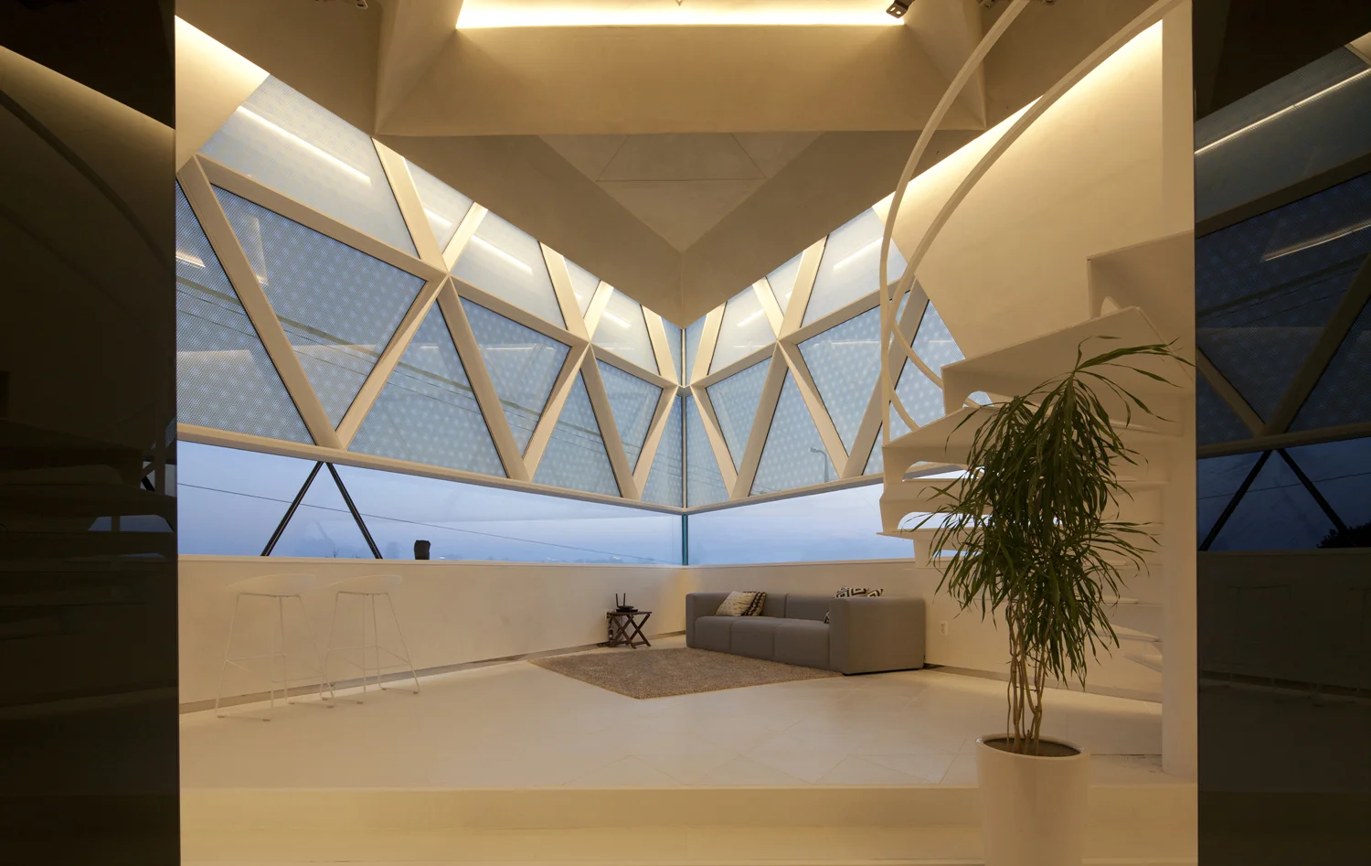 바다를 마주하게 되는 복층 유리에 패턴을 인쇄했다. 바다는 보여야 하지만, 오후에 들어오는 햇빛은 막아야 했기 때문이다. 유리 두 장에 따로 따로 인쇄한 패턴은 겹쳐지면서 무아레 패턴이라고 불리는 모양을 만들어냈다.